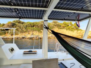 Cooking, refrigeration, and heating are all powered by electricity, and the dinghy also draws power for its electric outboard motor from the solar panels.